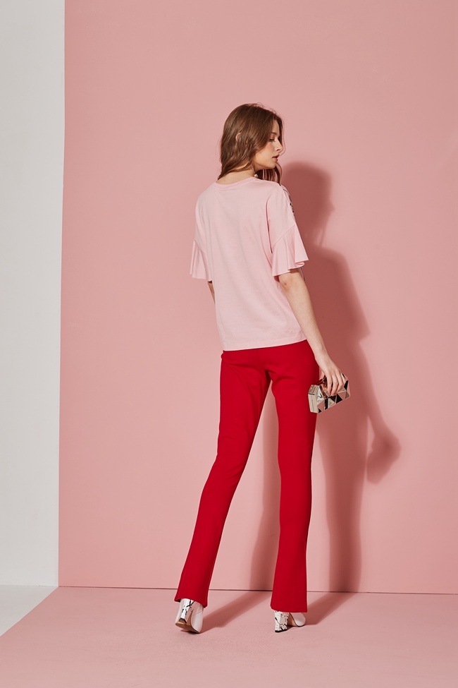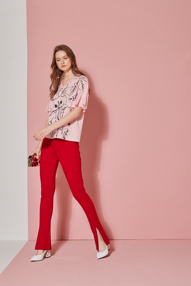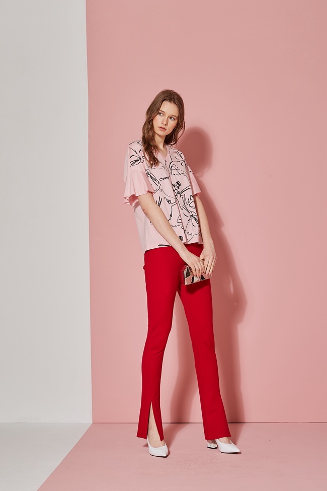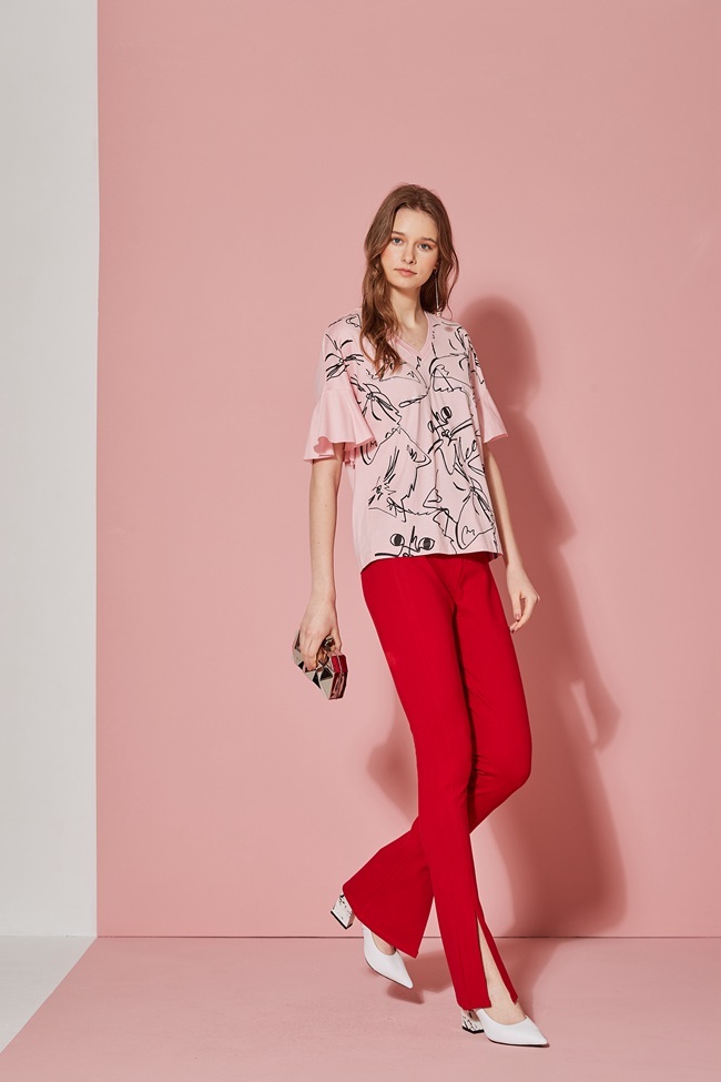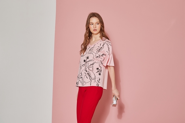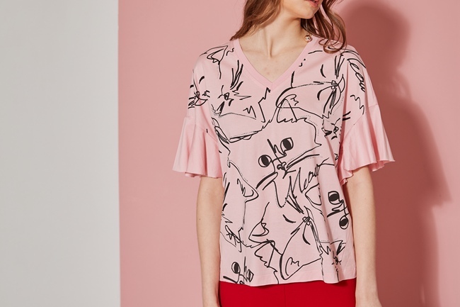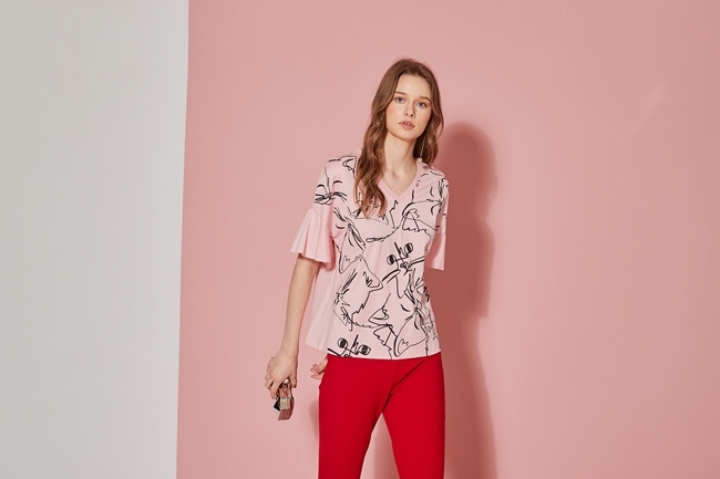 時尚V領印花荷葉喇叭袖拼接造型上衣-櫻花粉