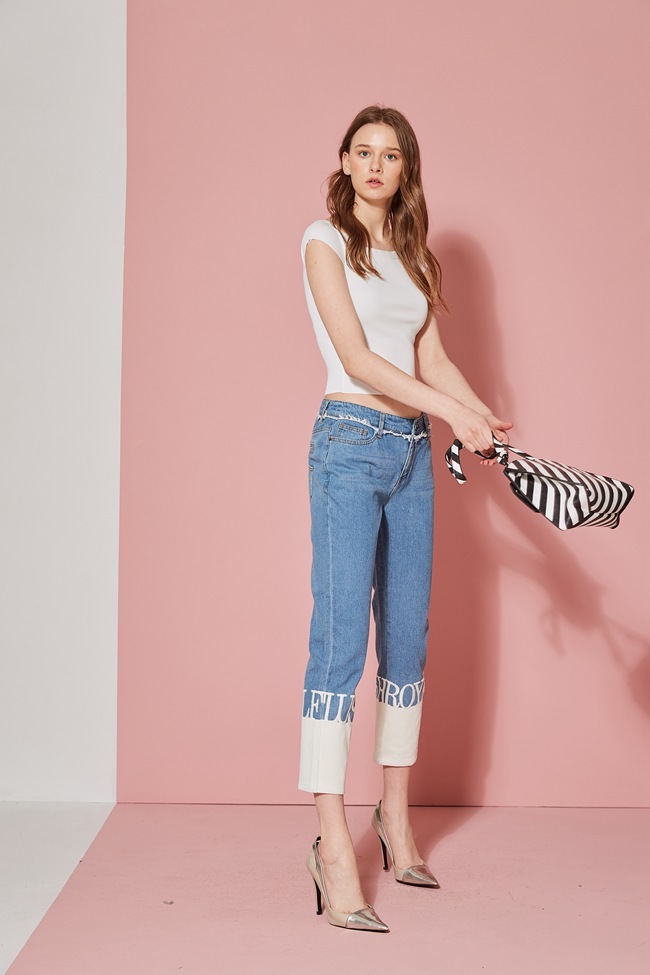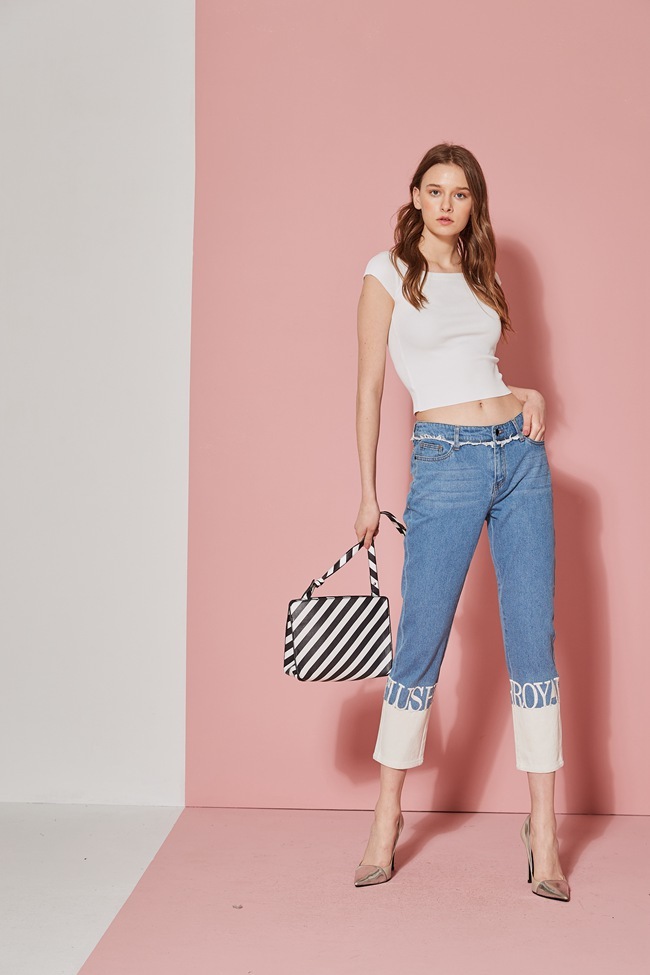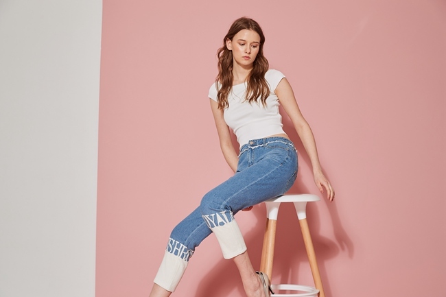時尚丹寧字母印花抓鬚刷白九分褲-牛仔藍