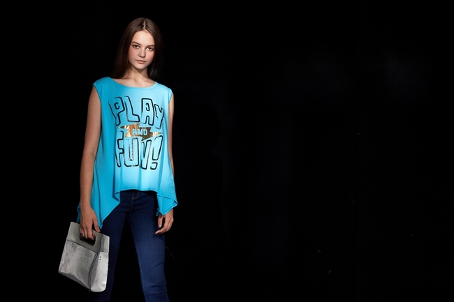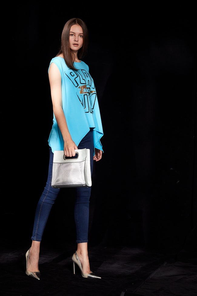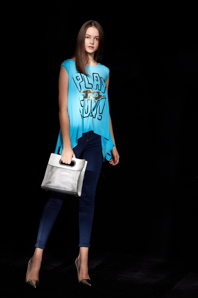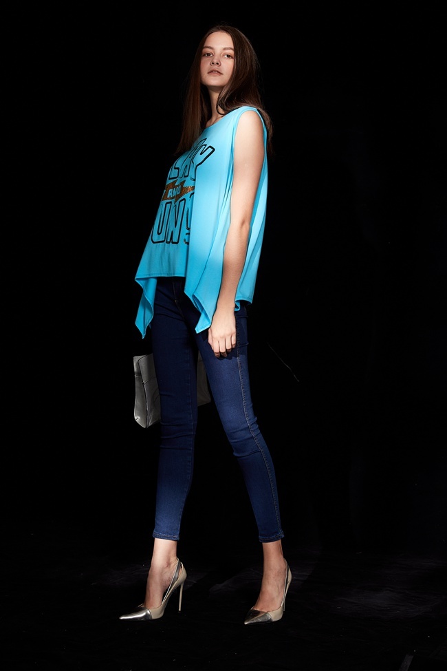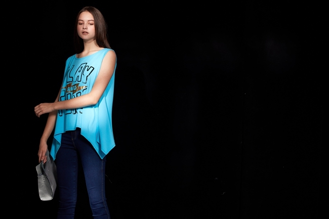 時尚休閒印花不規則下擺造型上衣-晴空藍