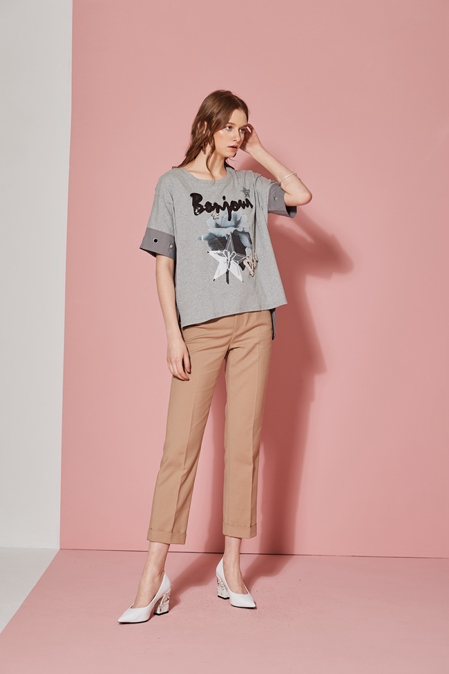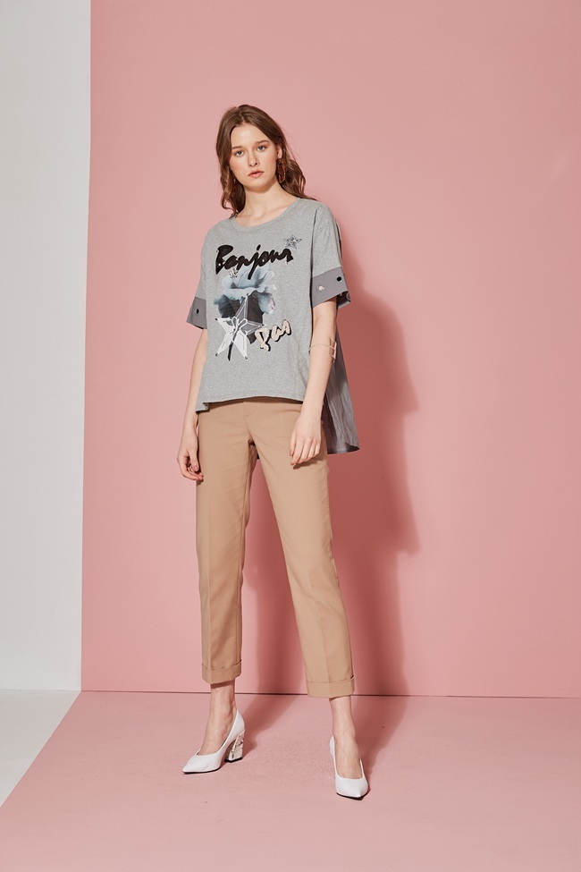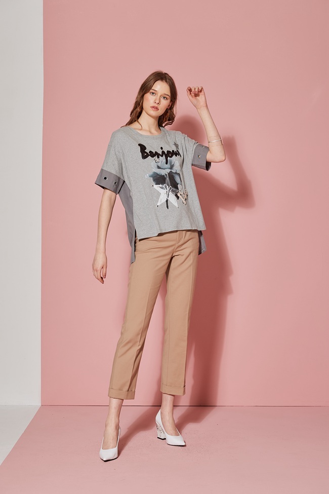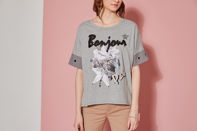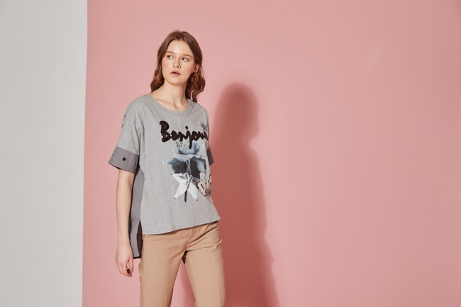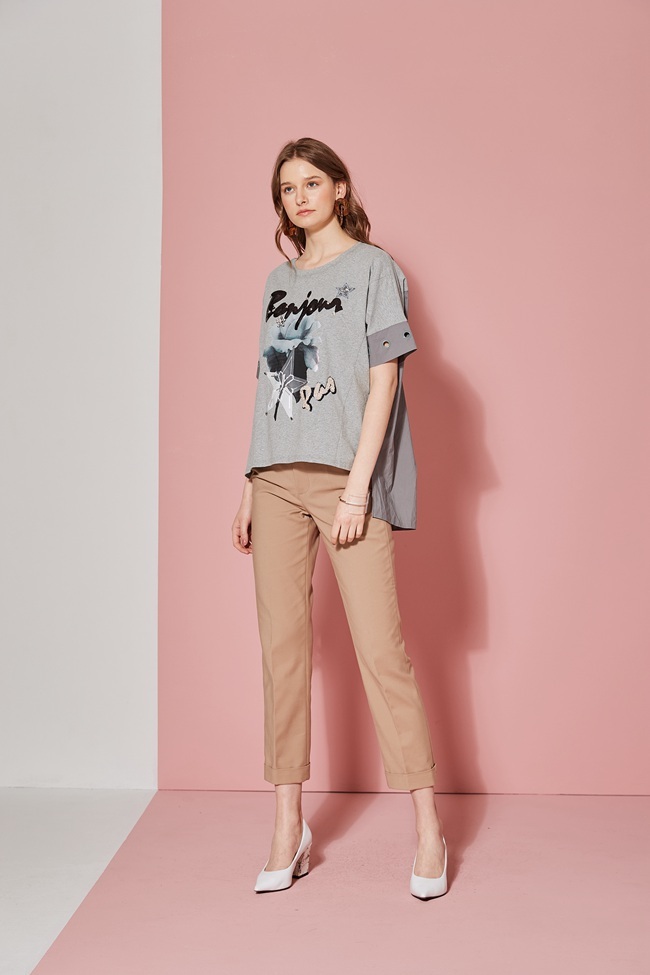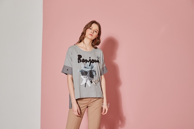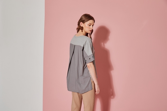 時尚印花前短後長拼接落肩造型上衣-高冷灰