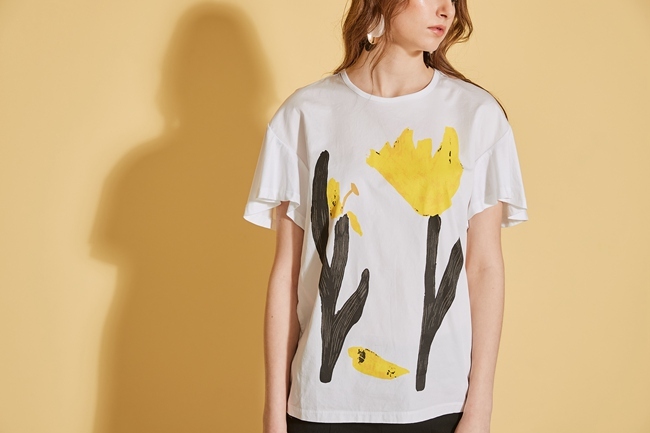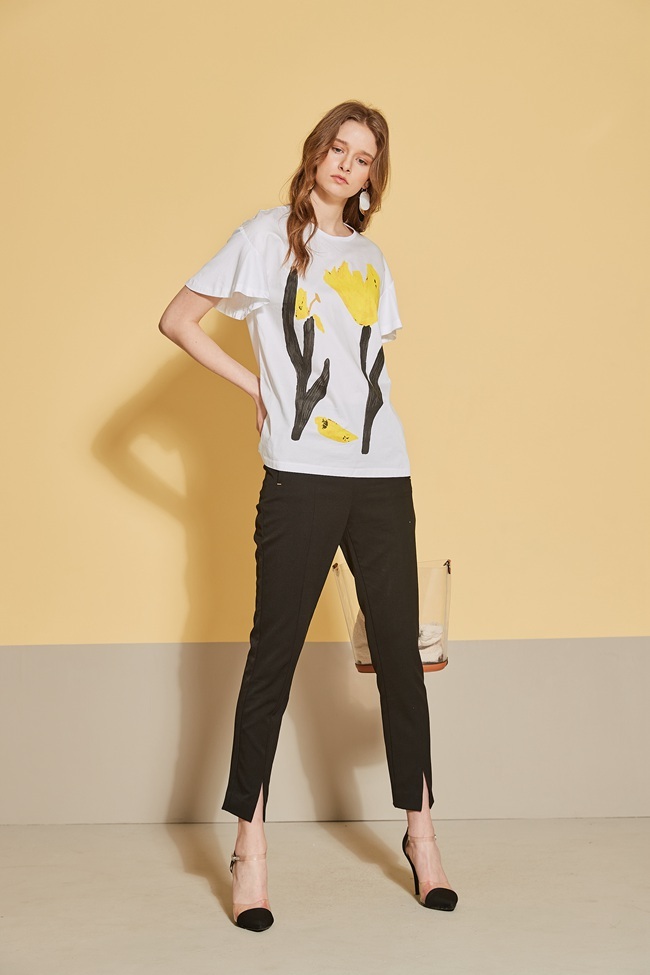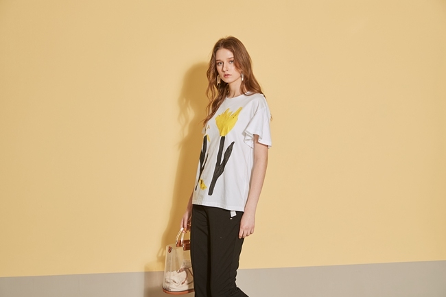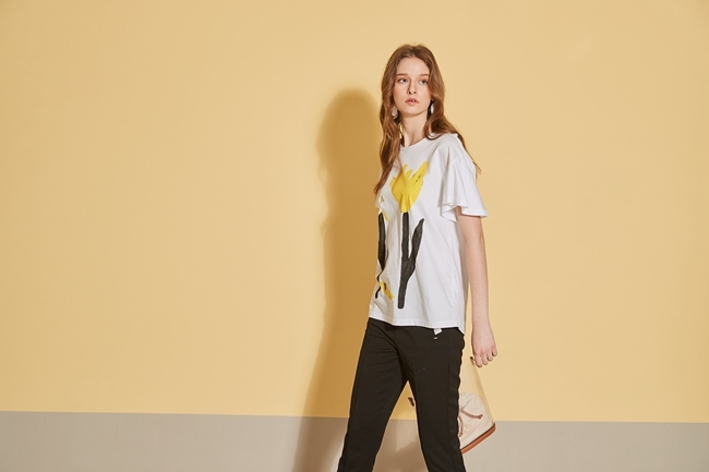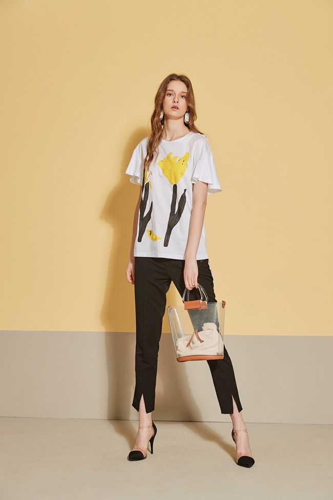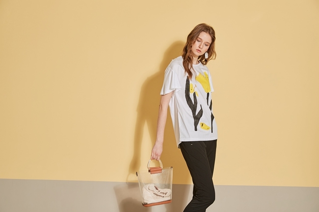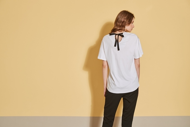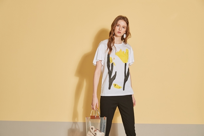 時尚印花喇叭袖拼接落肩造型上衣-白