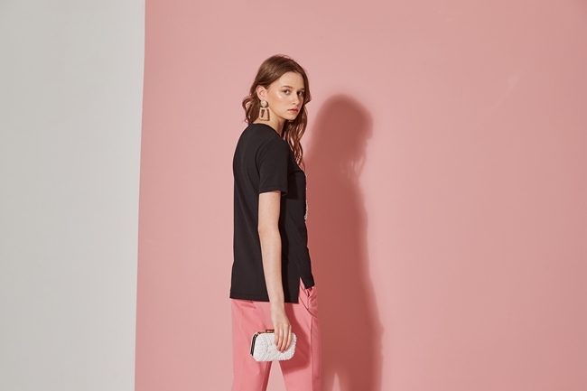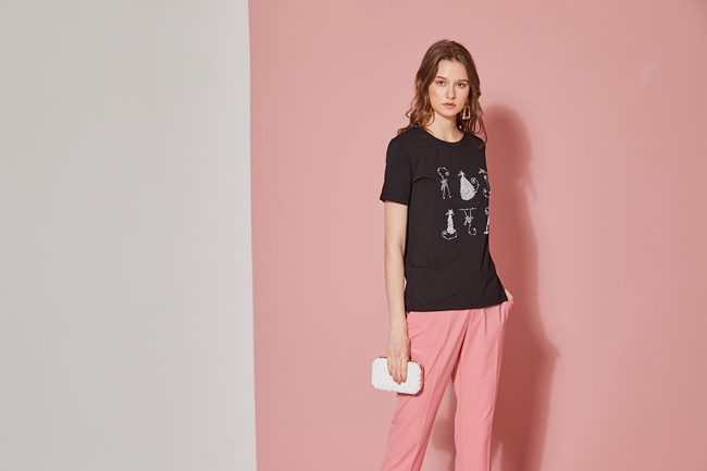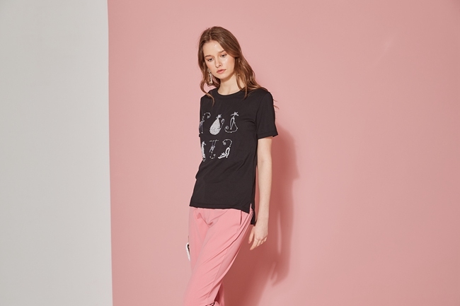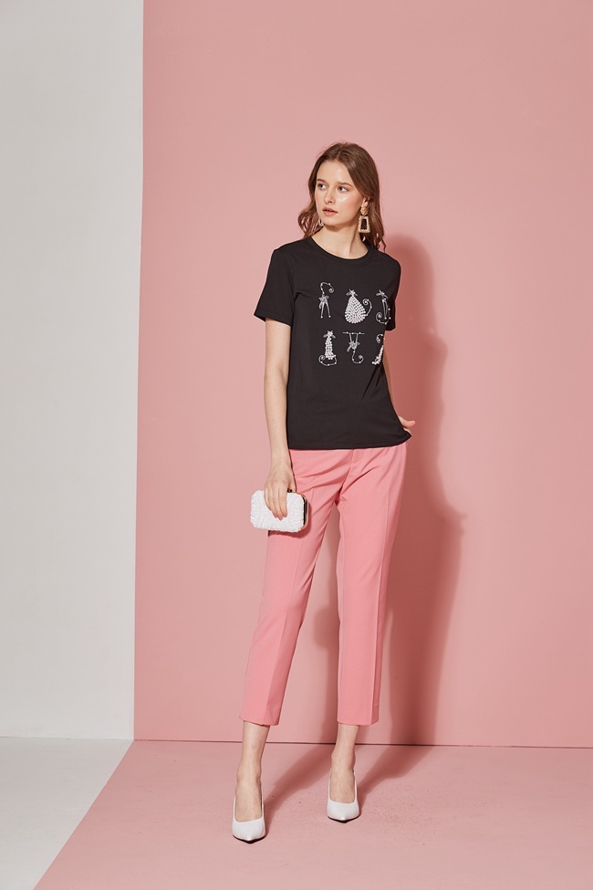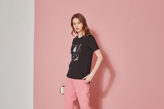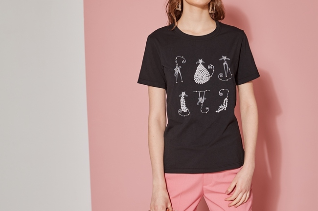 立體3D珍珠鑲飾印花造型上衣-曜石黑