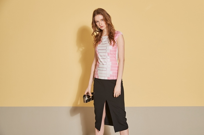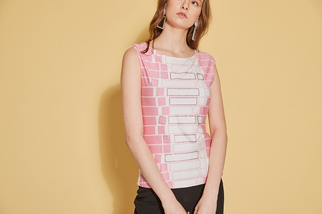 色塊撞色拼接燙鑽點綴造型上衣-玫瑰粉